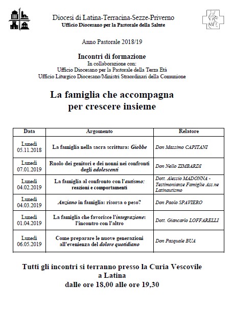 La Pastorale della Salute organizza una serie di incontri di formazione a cadenza mensile. Ogni incontro affronterà un tema diverso, ma che riguarda le difficoltà che incontrano oggi le famiglie. Oltre all'aspetto spirituale, che richiede il contesto, saranno affrontati argomenti che riguardano la vita di tutti i giorni. Le Associazioni "Ali e...