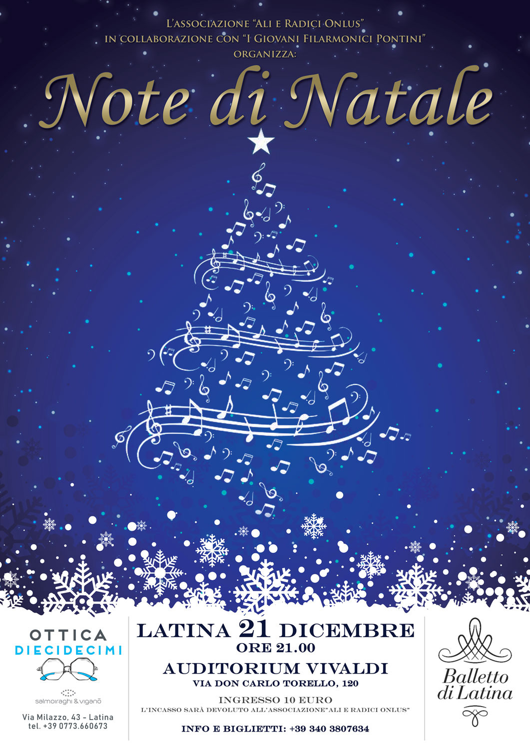 Ali e Radici Onlus in collaborazione con I Giovani Filarmonici Pontini organizzano un concerto di beneficenza dal titolo "Note di Natale".Il ricavato sarà utilizzato per le attività che mirano al contrasto del disagio giovanile nel territorio di Latina.Costo del biglietto 10 Euro.Per Info e prenotazioni: 3403807634